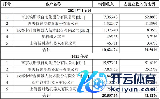 2021-2023年,公司对前五大客户销售占比分辨为79.45%、84.30%、92.12%,其中,对第一大客户埃斯顿销售占比均超50%,存在紧要依赖。