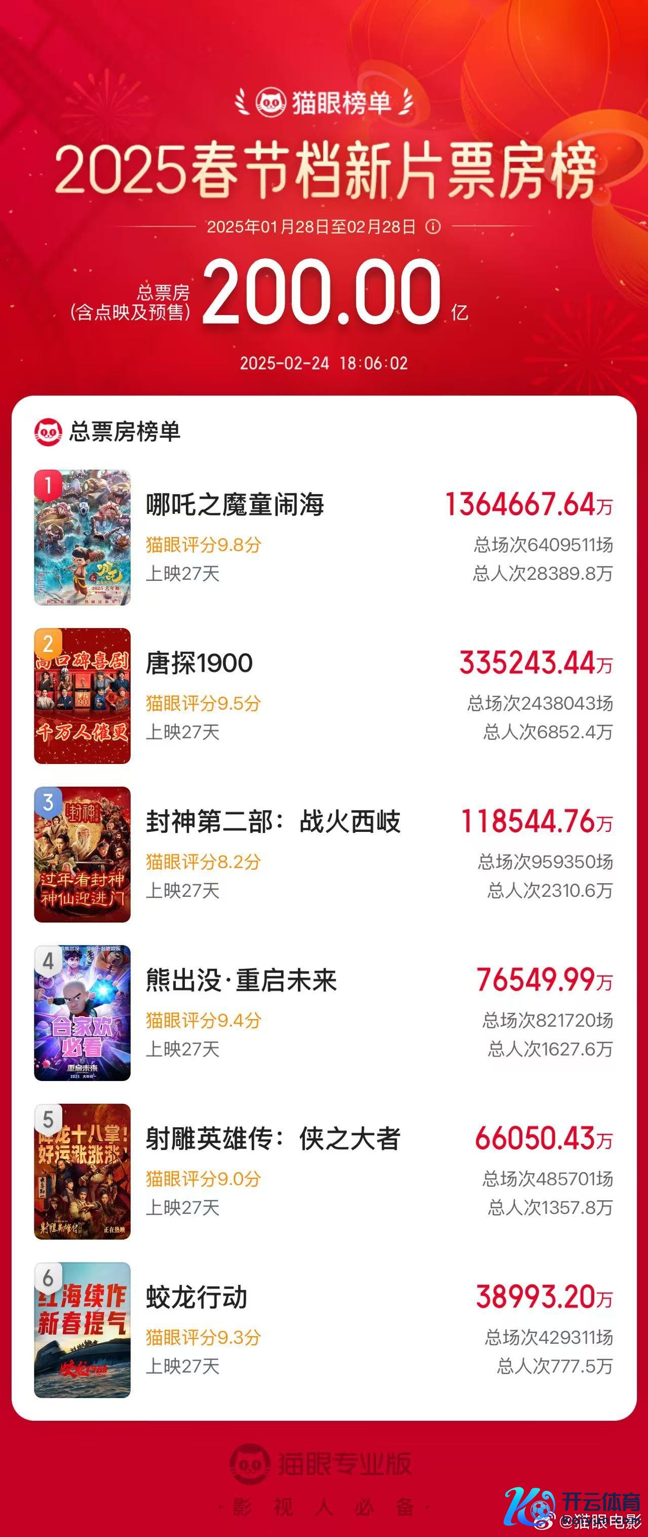 据猫眼专科版数据,2025年2月24日18时,2025春节档上映新片总票房(含预售)冲破200亿!其中《哪吒之魔童闹海》含预售总票房超136亿,成为民众动画电影票房冠军!